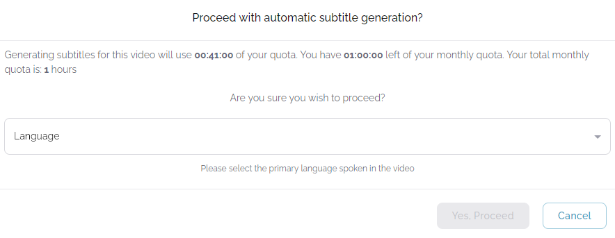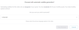 Modal text: “Proceed with automatic subtitle generation?
